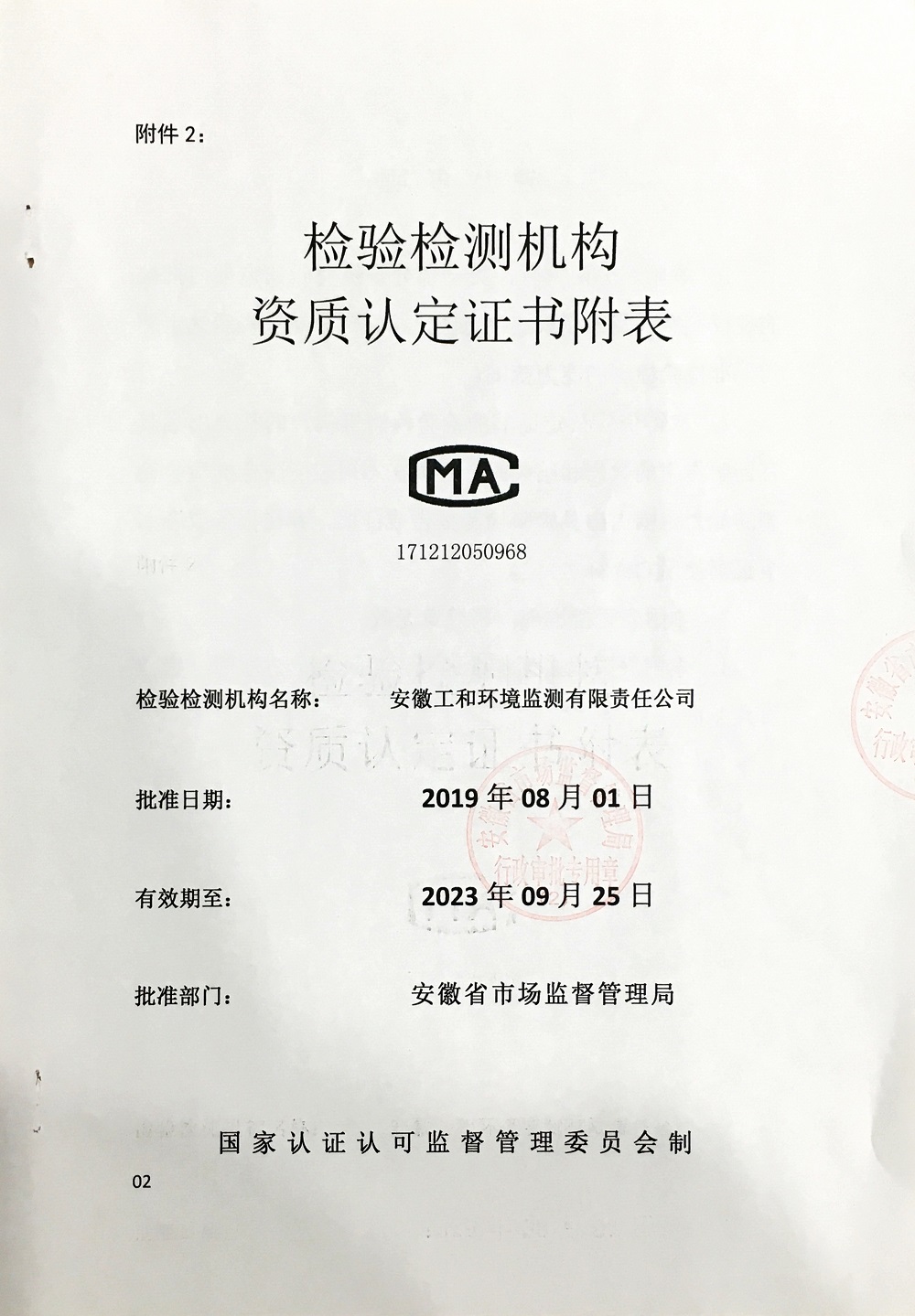 2019年8月1日,工和監(jiān)測正式獲批由安徽省市場監(jiān)督管理局頒發(fā)的《檢驗檢測機構(gòu)資質(zhì)認(rèn)定證書附表(擴項)》,這是我公司自成立以來第四次獲批的資質(zhì)附表。