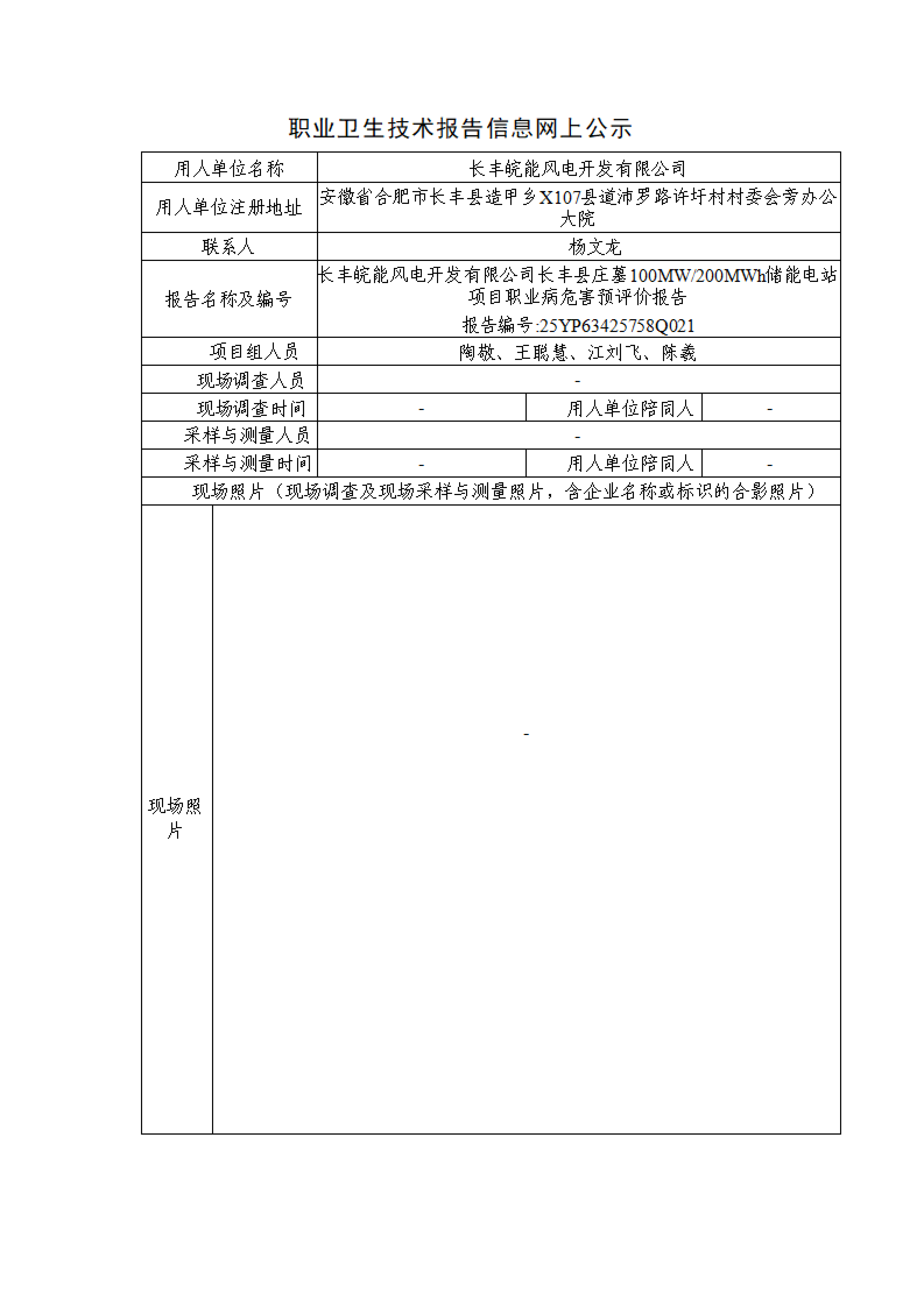長豐皖能風電開發有限公司長豐縣莊墓100MW/200MWh儲能電站項目職業病危害預評價報告 報告編號:25YP63425758Q021
