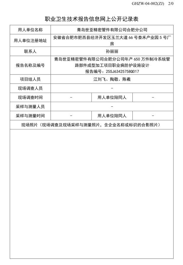 青島世亞精密管件有限公司合肥分公司年產650萬件制冷系統管路部件成型加工項目職業病危害預評價報告 報告編號:25YP63425758Q026