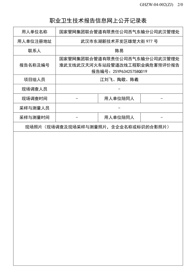 國家管網集團聯合管道有限責任公司西氣東輸分公司武漢管理處淮武支線武漢天河火車站段管道改線工程職業病危害預評價報告 報告編號:25YP63425758Q019