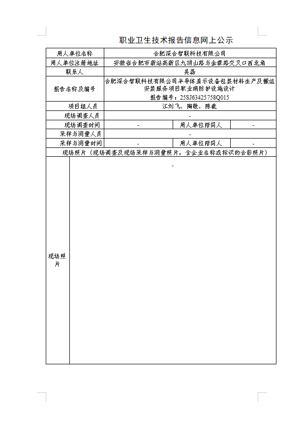 合肥深合智聯科技有限公司半導體顯示設備包裝材料生產及搬運安裝服務項目職業病危害預評價報告 報告編號:25YP63425758Q012