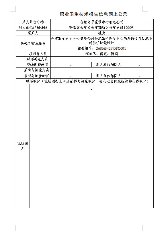 合肥離子醫學中心有限公司合肥離子醫學中心病房改造項目職業病防護設施設計 報告編號:26SJ63425758Q001